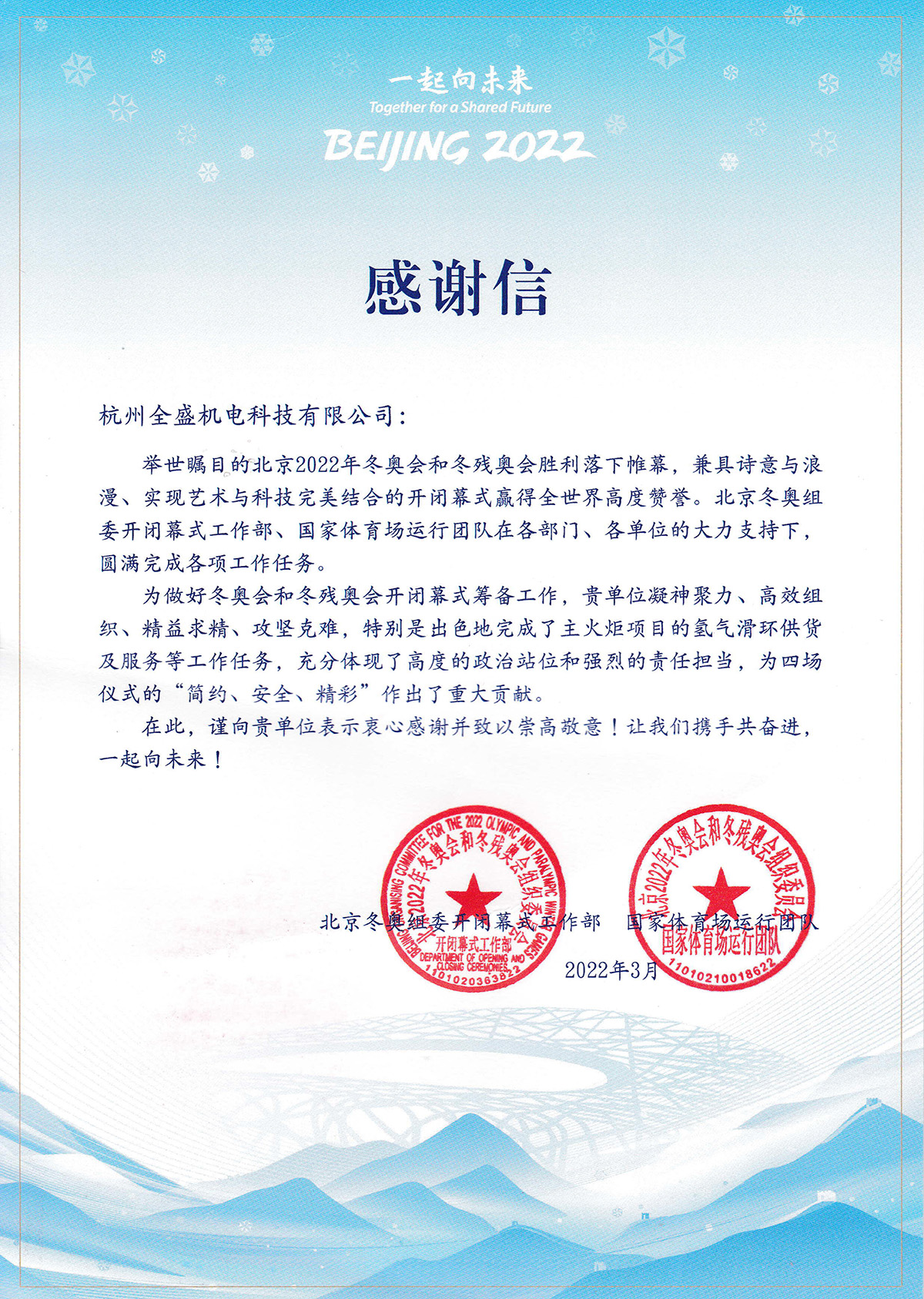 我司收到2022年冬奧會(huì)和冬殘奧會(huì)組織委員會(huì)感謝信!