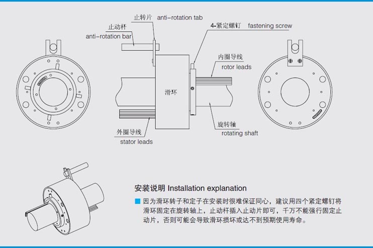 ■ 在滑環(huán)安裝時(shí),務(wù)必要保護(hù)好導(dǎo)線,避免因?qū)w絕緣層損壞而影響產(chǎn)品品質(zhì)